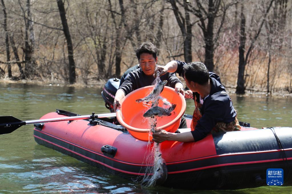 5月7日,養殖基地工作人員在放養區打撈細鱗鮭。