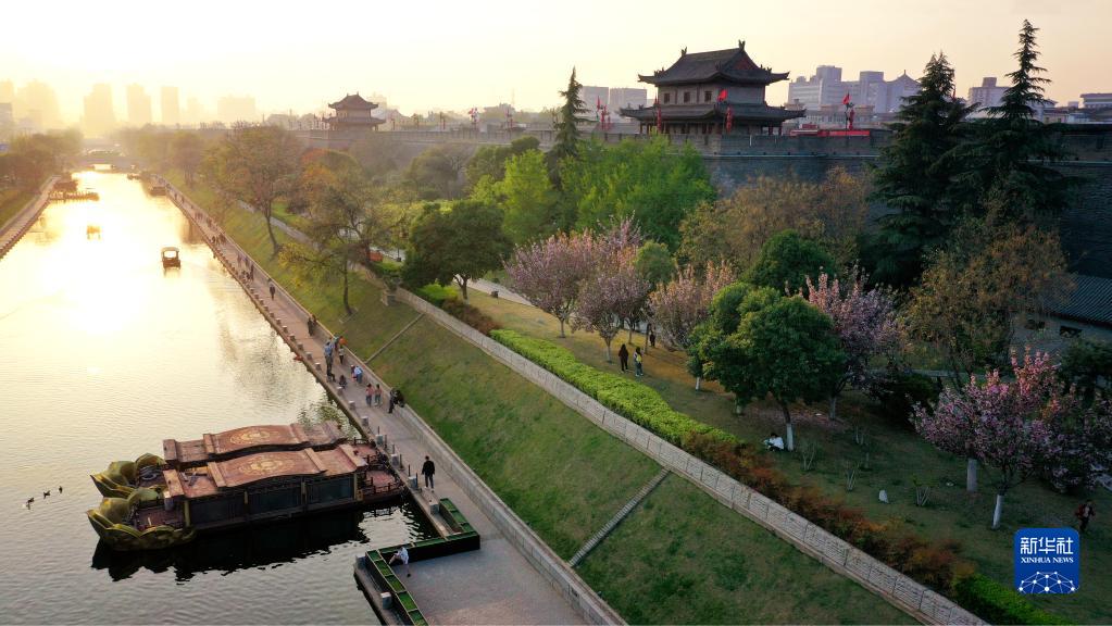 夕陽(yáng)下的西安城墻南段(4月1日攝,無(wú)人機照片)。