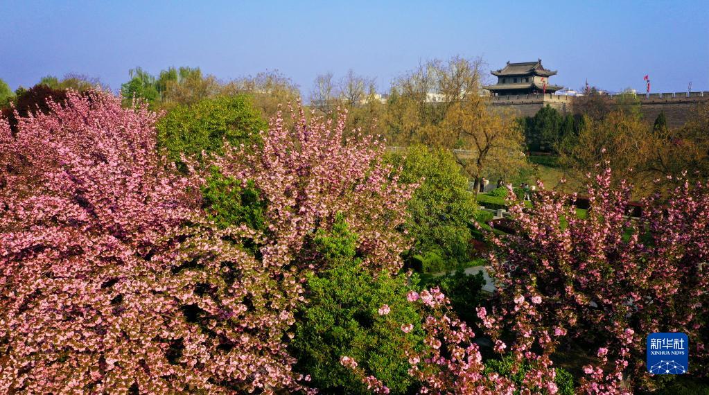 西安城墻掩映在繁花之中(4月1日攝,無(wú)人機照片)。