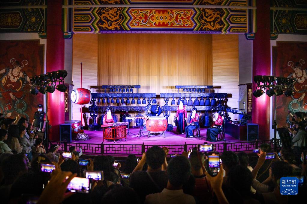 游客在西安鼓樓內觀(guān)看演出(5月1日攝)。