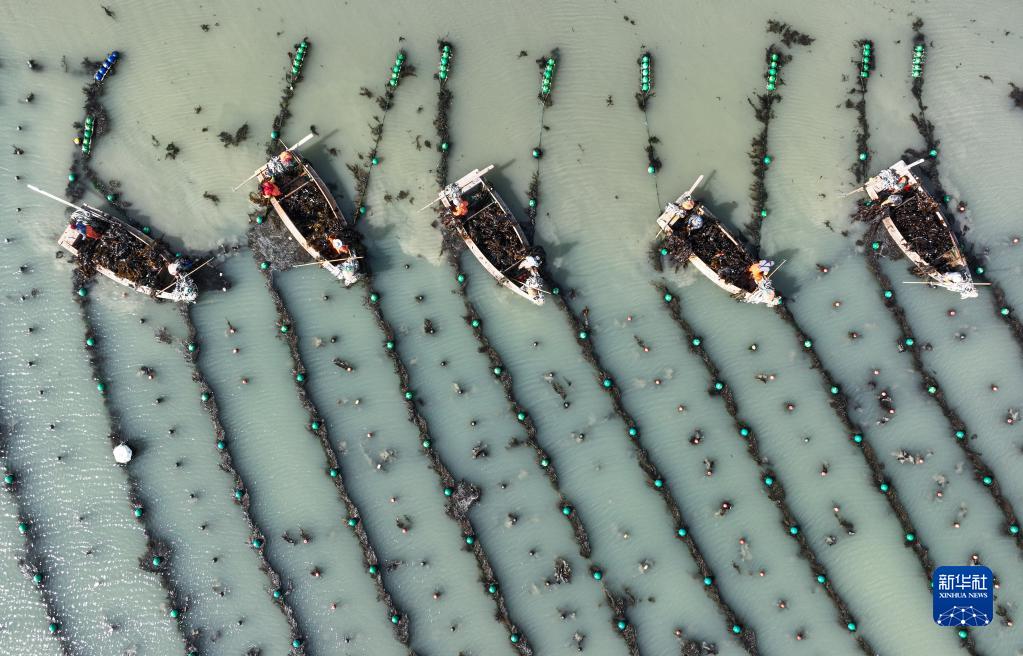 5月8日,在山東省榮成市愛(ài)倫灣海域海帶養殖區,漁民采收海帶(無(wú)人機照片)。