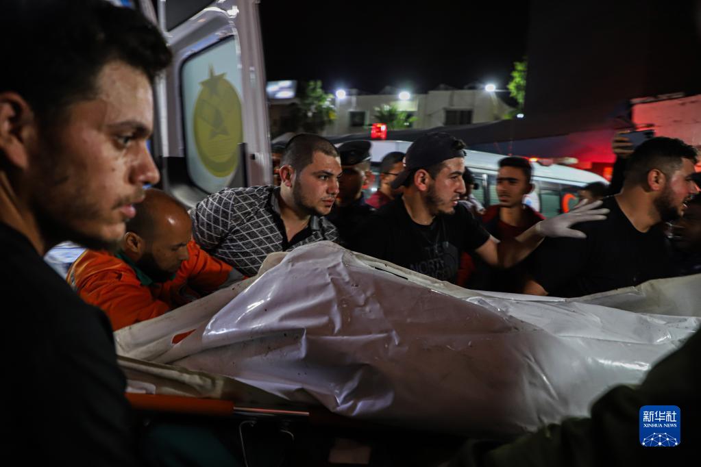 5月9日,在加沙城,人們將一具空襲遇難者遺體運送到醫院。