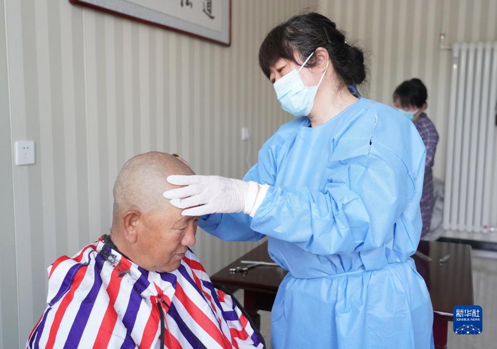 5月9日,在北京市平谷區西樊各莊村“養老驛站”,工作人員為老人理發(fā)。