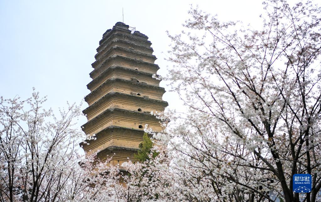 春花掩映中的西安小雁塔(3月15日攝)。