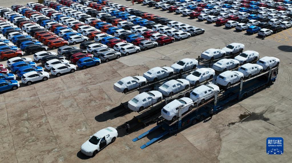 5月9日,在江蘇連云港港,大批商品車(chē)集結碼頭等待裝船(無(wú)人機照片)。