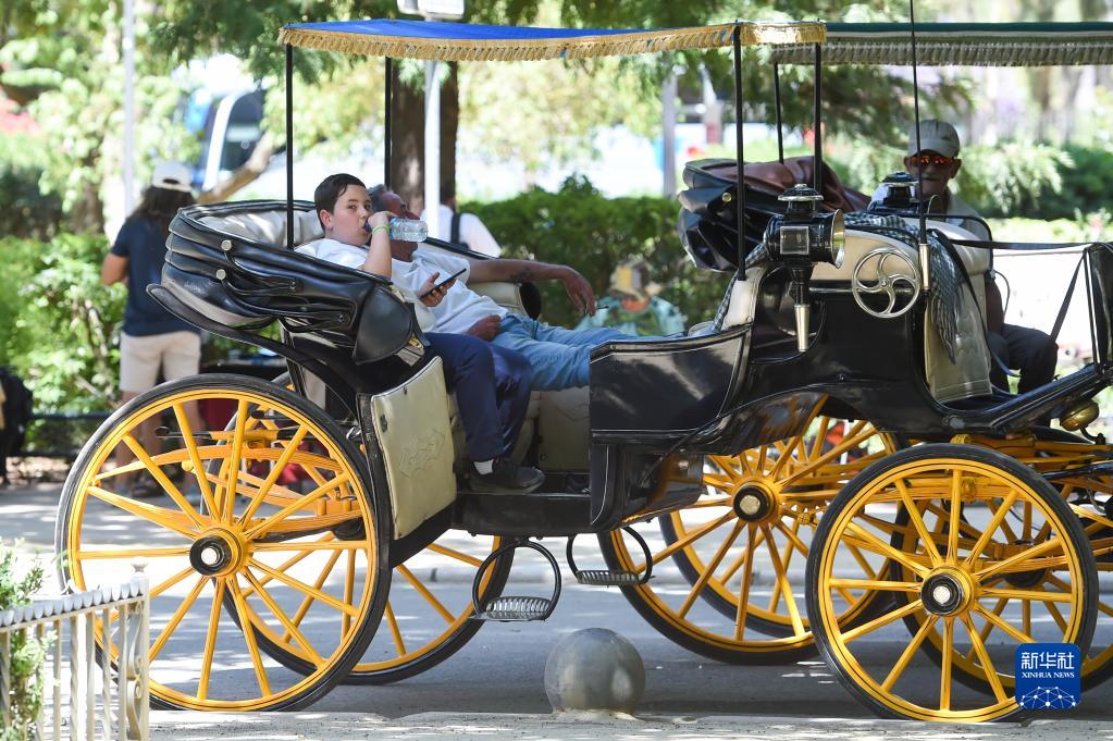 5月7日,人們在西班牙塞維利亞街頭乘涼。