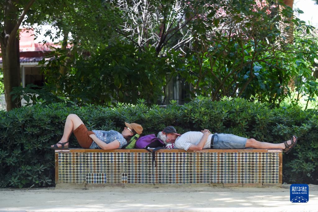 5月7日,人們在西班牙塞維利亞街頭乘涼。