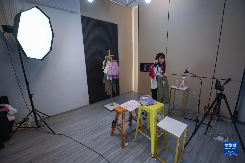 5月10日,在位于湖州市吳興區織里鎮的一家童裝企業(yè)內,工作人員在直播。