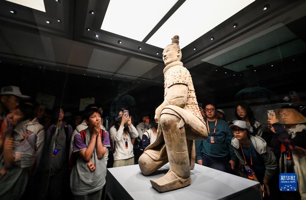 游客在秦兵馬俑二號坑遺址參觀(guān)跪射俑(4月26日攝)。