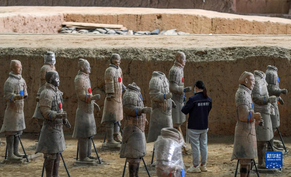 工作人員在秦兵馬俑一號坑遺址進(jìn)行秦俑修復(4月26日攝)。