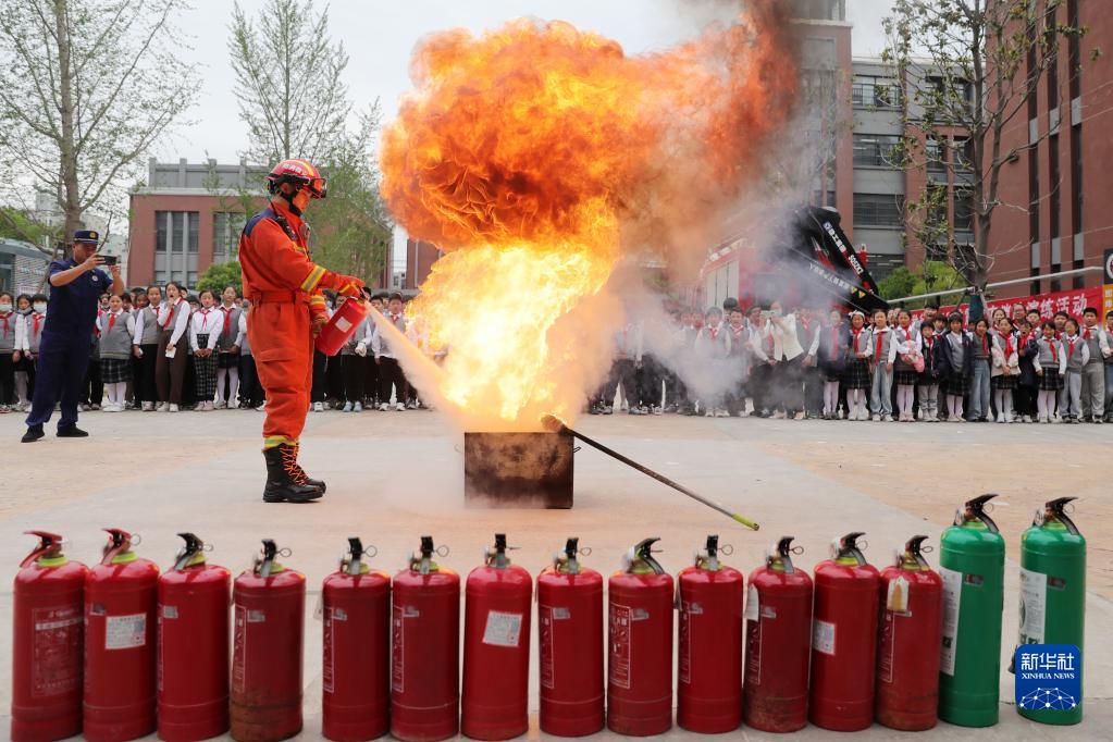 5月10日,在安徽省淮北市泉山路學(xué)校,消防人員為學(xué)生們演示滅火器滅火。