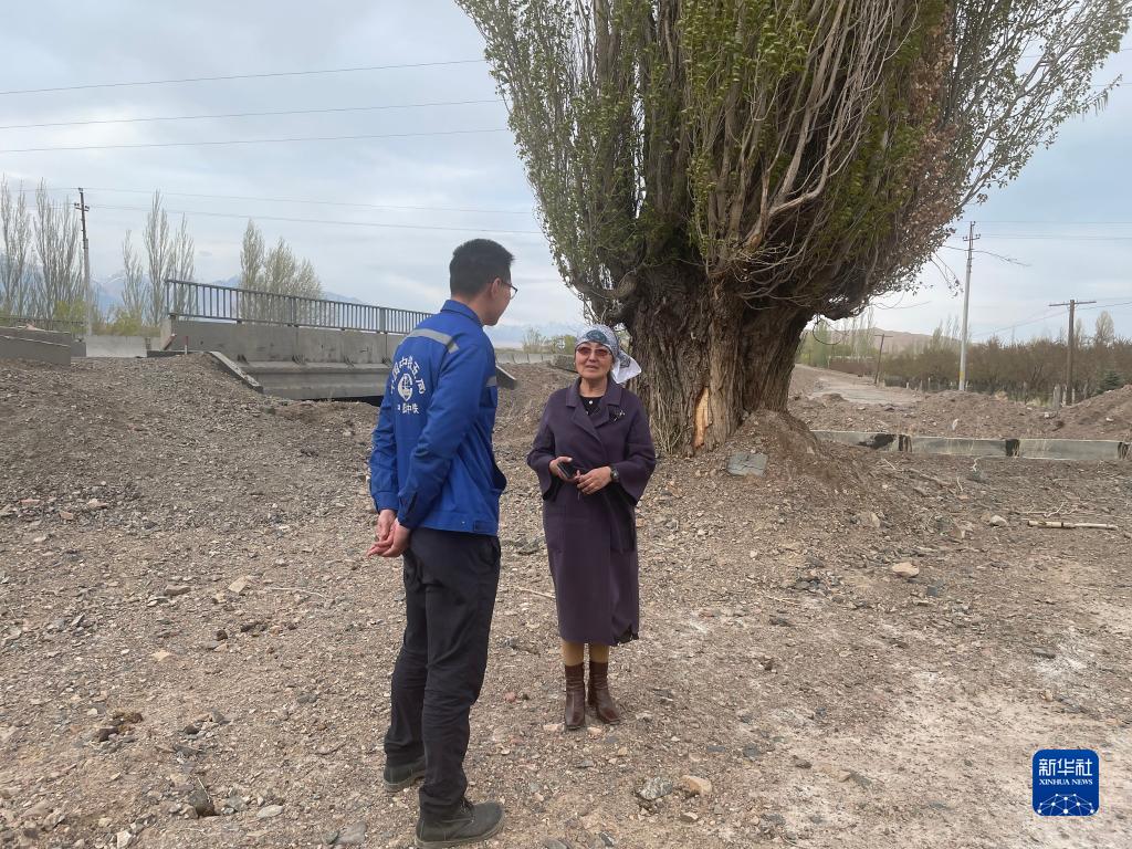 4月25日,在吉爾吉斯斯坦阿克奧隆村,中鐵五局工作人員王尹?。ㄗ螅┡c阿克奧隆村前村委會(huì )主任瑪伊拉姆·卡迪拉列娃在一處水渠旁交談。
