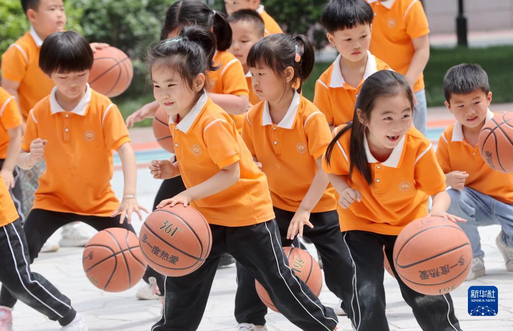 5月10日,在德清縣雷甸鎮中興未來(lái)社區,小朋友在練習籃球。