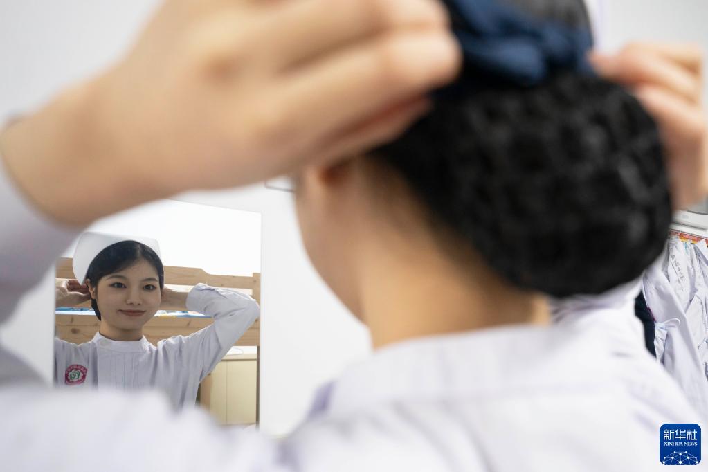 5月11日,在貴州省黔東南苗族侗族自治州岑鞏縣婦幼保健院,醫護人員在休息室整理妝容準備上班。
