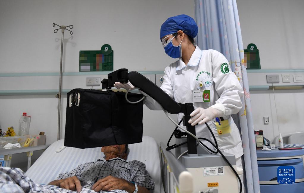 5月10日,在廣西南寧市第四人民醫院,黃小賢在病房里給病人治療。