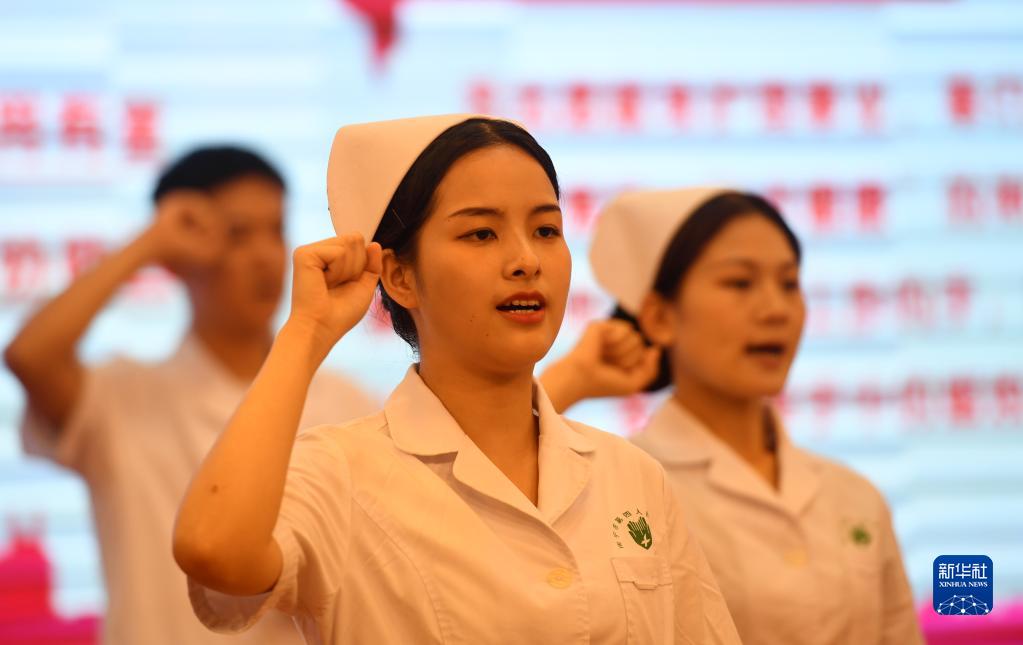 5月10日,在廣西南寧市第四人民醫院,黃小賢(前)和同事在醫院慶祝國際護士節活動(dòng)中進(jìn)行新入職護士宣誓。