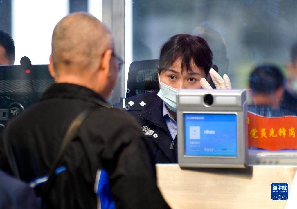 5月10日,在新疆霍爾果斯聯(lián)檢大廳出境通道,霍爾果斯出入境邊防檢查站執勤民警為出境人員辦理邊防檢查手續。