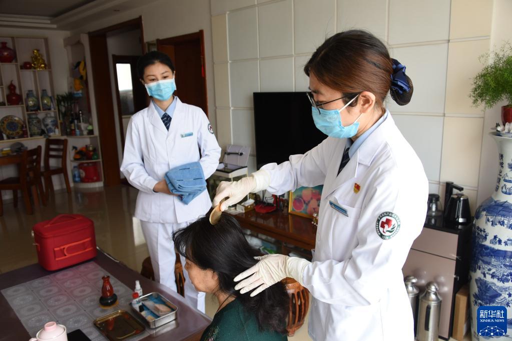 5月10日,青島西海岸新區中醫醫院網(wǎng)約護士張奕(右)在患者家中進(jìn)行頭部銅砭刮痧治療。
