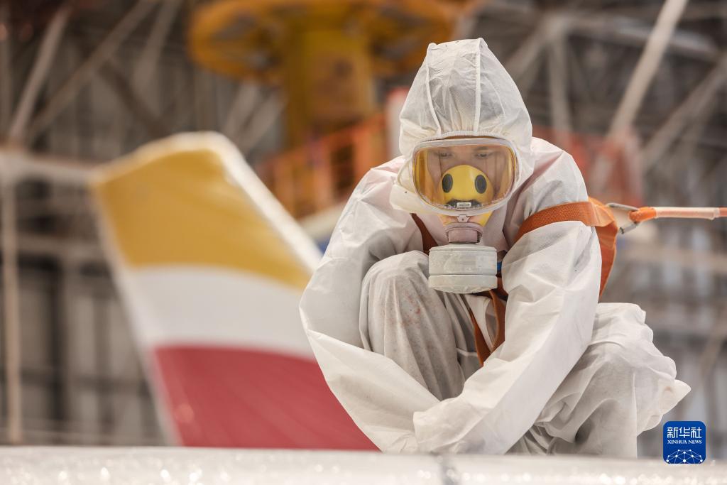 5月11日,噴涂作業(yè)員對空客A350-900寬體客機進(jìn)行打磨除漆。