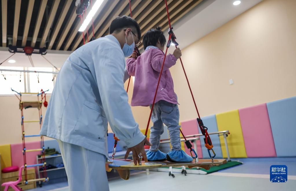 5月11日,康復治療師在渭南腦病康復醫院幫助患兒進(jìn)行運動(dòng)治療。
