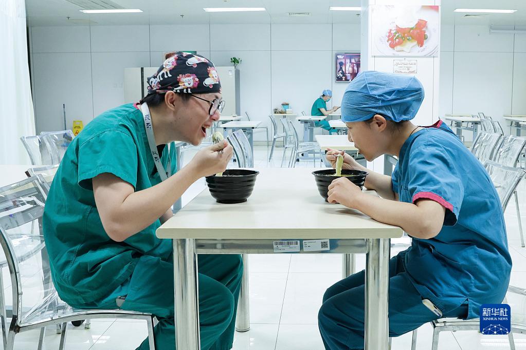 5月9日20時(shí)許,北京協(xié)和醫院,剛剛下班的手術(shù)室護士馮翮飛(左)和周航在手術(shù)室餐廳內用餐交流。