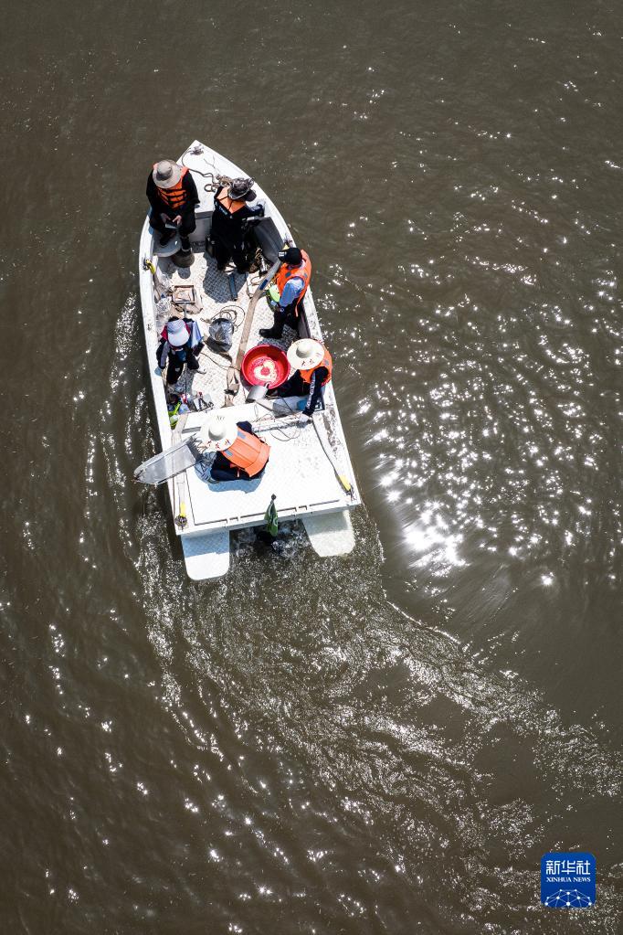 5月12日,監測人員在湖北省赤壁市江段進(jìn)行底棲動(dòng)物樣品采集(無(wú)人機照片)。