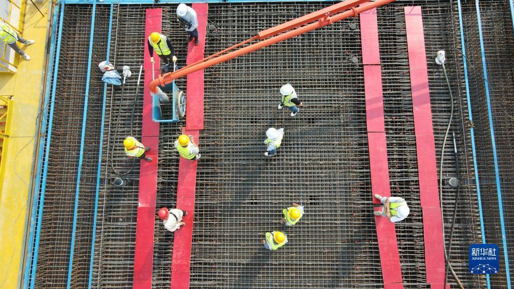 5月12日,中國鐵建大橋局施工人員在新建滬寧合高鐵安徽段首榀箱梁澆筑現場(chǎng)作業(yè)(無(wú)人機照片)。