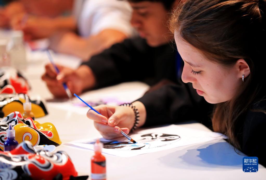 5月11日,在英國倫敦,學(xué)生在2023“國際中文日”英國主題活動(dòng)上繪描戲曲臉譜。