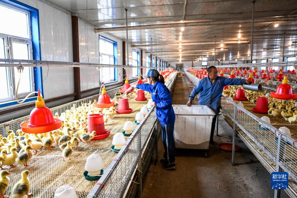 5月12日,阿榮旗全順大鵝養殖專(zhuān)業(yè)合作社工人給鵝雛喂食。