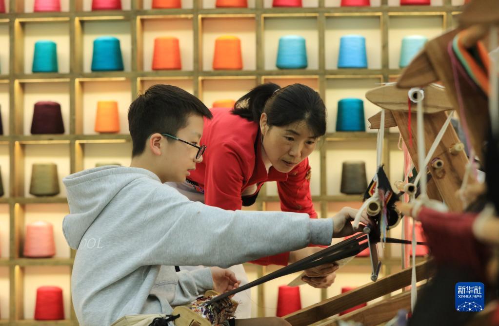 5月12日,來(lái)自上海包玉剛實(shí)驗學(xué)校的學(xué)生在張家界市武陵源區乖幺妹土家族織錦基地學(xué)習體驗土家族織錦非遺技藝。