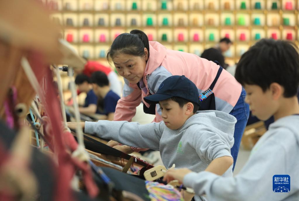 5月12日,來(lái)自上海包玉剛實(shí)驗學(xué)校的學(xué)生在張家界市武陵源區乖幺妹土家族織錦基地學(xué)習體驗土家族織錦非遺技藝。