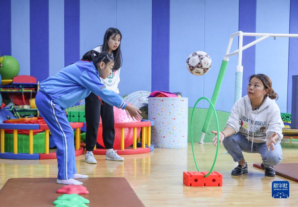 在陜西省渭南市特殊教育學(xué)校的感覺(jué)統合室,王鴿幫助女兒趙懿菲進(jìn)行訓練(5月9日攝)。