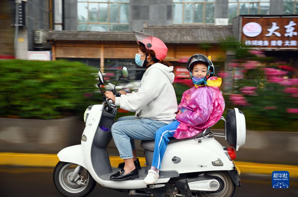 放學(xué)后王鴿騎車(chē)帶女兒趙懿菲回家(5月9日攝)。
