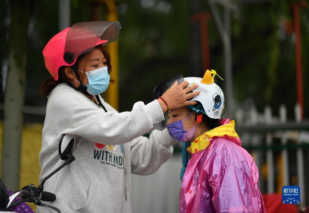 5月9日,在陜西省渭南市特殊教育學(xué)校,王鴿在放學(xué)后為女兒趙懿菲戴上頭盔。