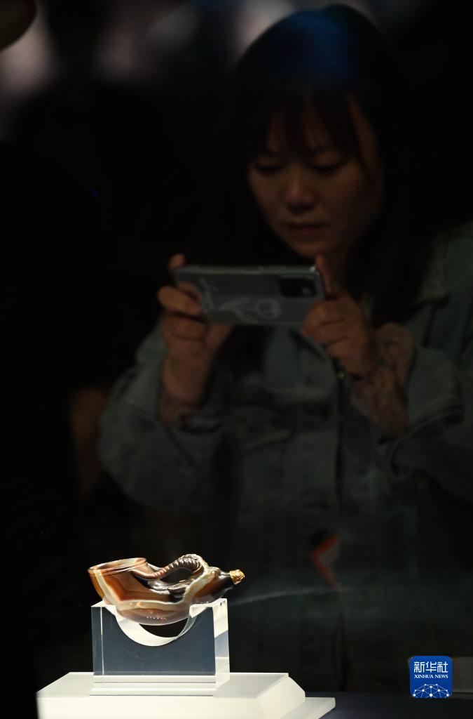 5月11日,游客在陜西歷史博物館參觀(guān)鑲金獸首瑪瑙杯。鑲金獸首瑪瑙杯的造型,與起源于古希臘的酒具“來(lái)通”相似,“來(lái)通”曾廣泛流行于中亞、西亞地區,沿著(zhù)絲綢之路不斷東傳進(jìn)入中國。