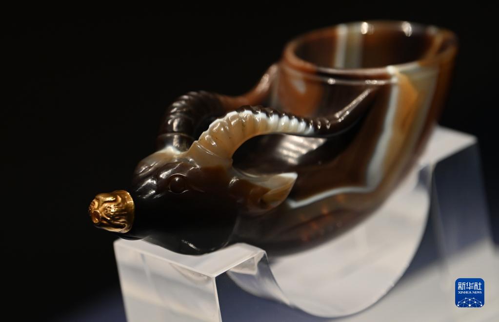 這是在陜西歷史博物館拍攝的鑲金獸首瑪瑙杯(5月11日攝)。鑲金獸首瑪瑙杯的造型,與起源于古希臘的酒具“來(lái)通”相似,“來(lái)通”曾廣泛流行于中亞、西亞地區,沿著(zhù)絲綢之路不斷東傳進(jìn)入中國。