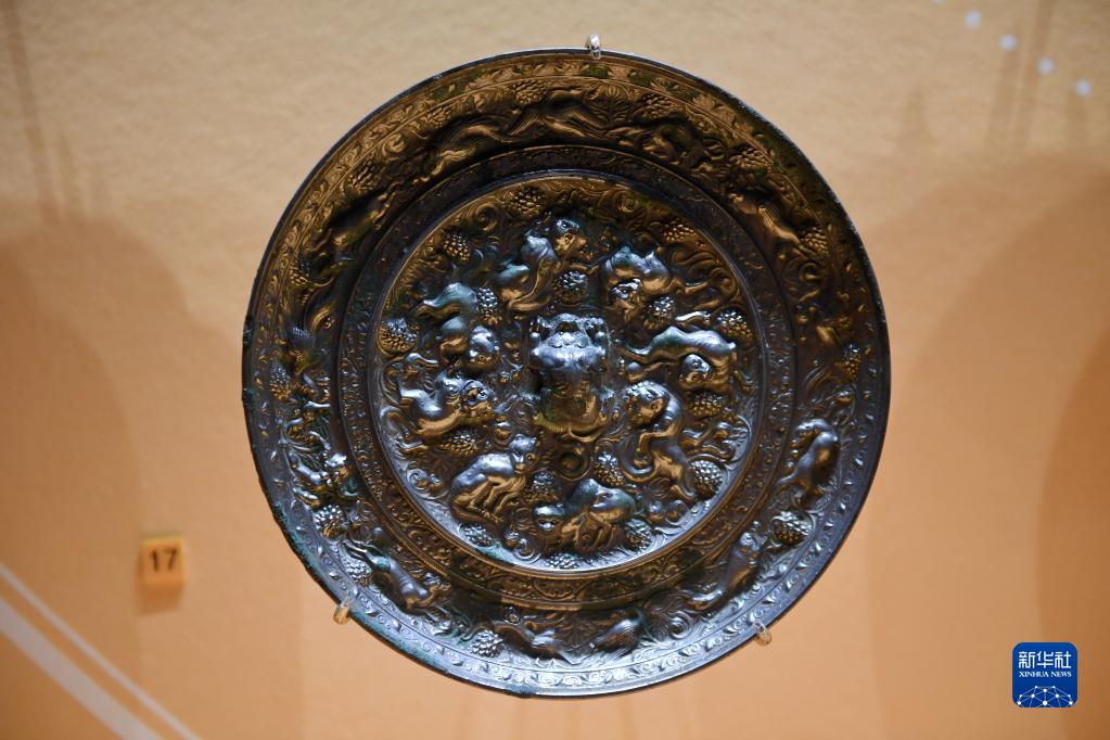 這是在西安博物院展出的唐代瑞獸葡萄紋銅鏡(5月8日攝)。葡萄、苜蓿等農作物通過(guò)絲綢之路傳入中國。