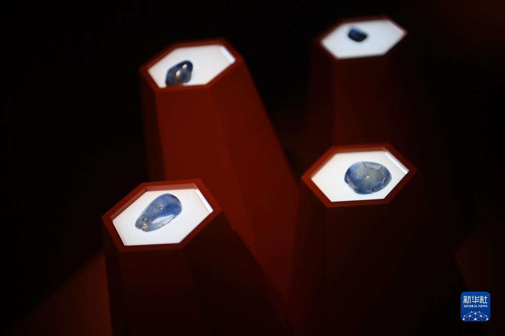 這是在陜西歷史博物館拍攝的藍寶石(5月11日攝)。天然寶石通過(guò)絲綢之路以商業(yè)貿易的形式進(jìn)入中國。