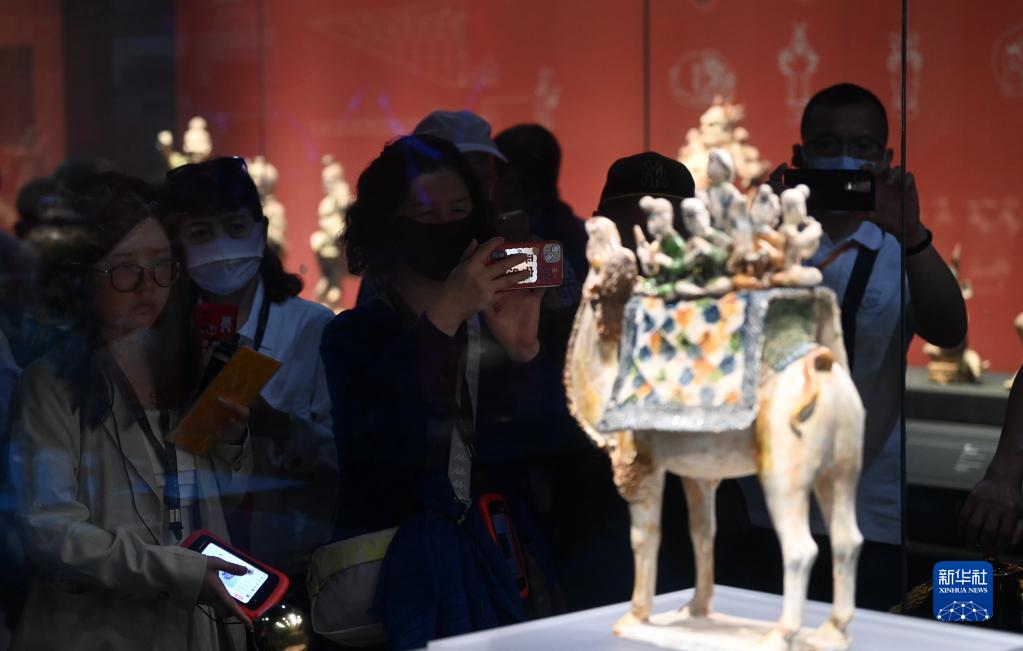 5月11日,游客在陜西歷史博物館參觀(guān)唐三彩駱駝載樂(lè )俑。這件唐三彩駱駝載樂(lè )俑既是唐代文化藝術(shù)、制作工藝發(fā)達昌盛的重要物證,也見(jiàn)證了絲綢之路上藝術(shù)的交流與融合。