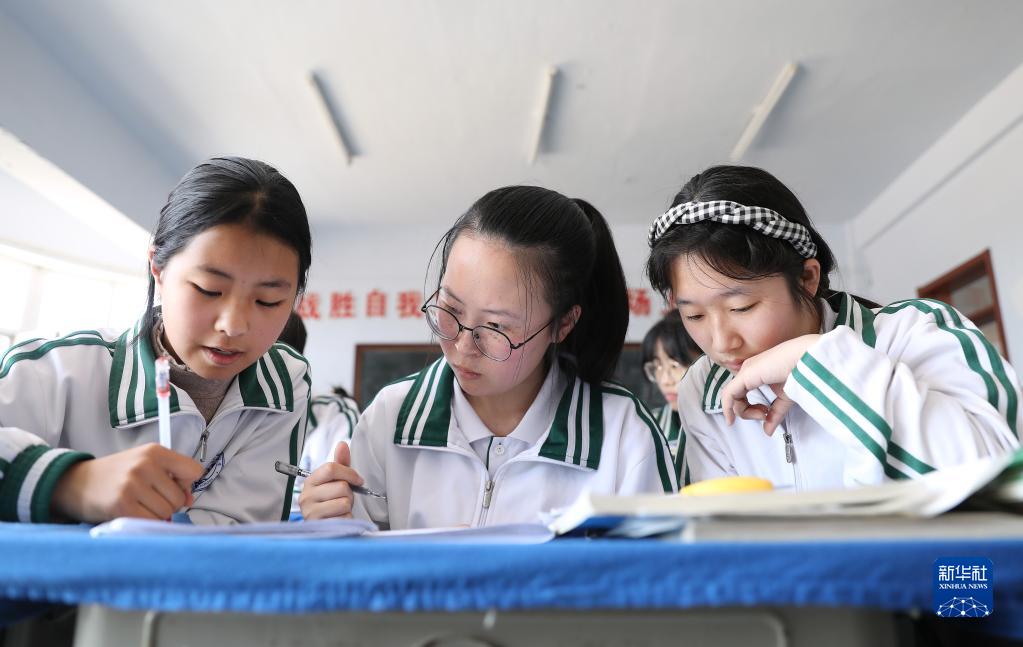 女兒李昕偉(中)課間和同學(xué)們交流習題,由于聽(tīng)不太清,她需要目不轉睛地盯著(zhù)同學(xué)的筆(5月8日攝)。