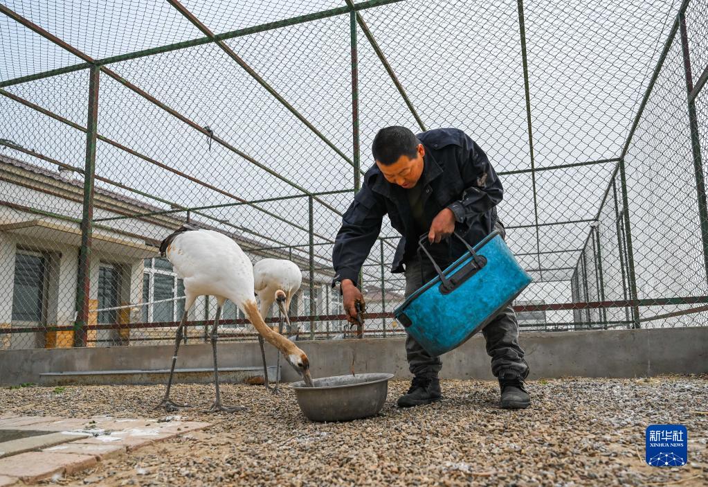 5月11日,徐沃德樂(lè )胡給救助的丹頂鶴喂食。