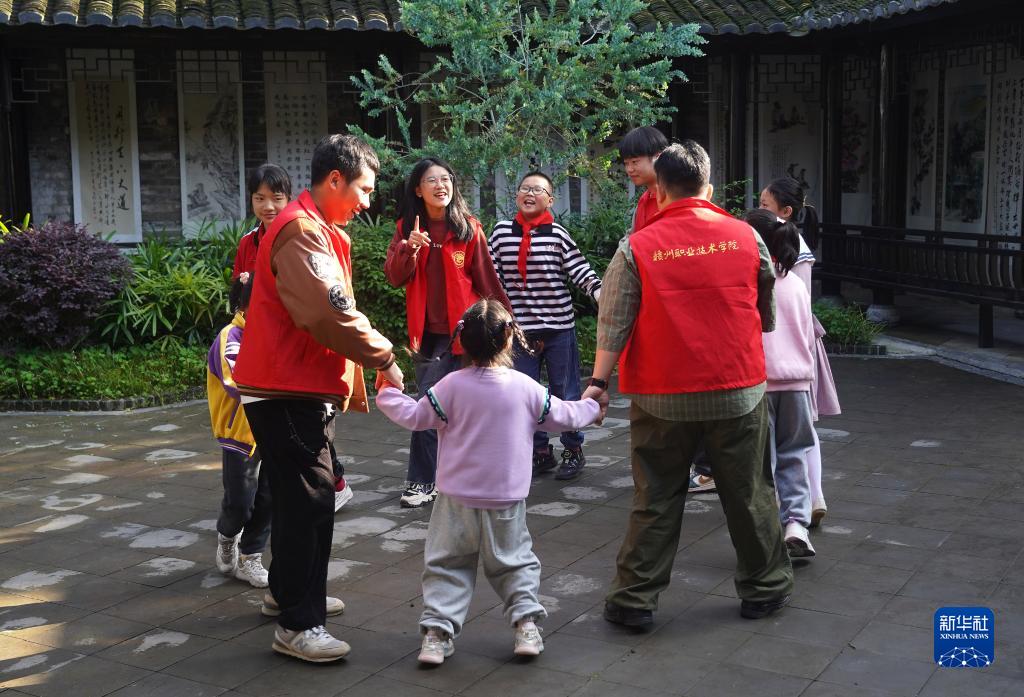 在江西省贛州市南康區盧屋村,志愿者與孩子們一起互動(dòng)游戲(4月26日攝)。