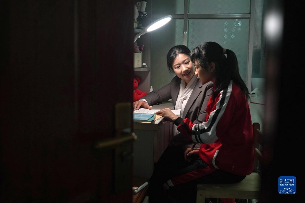 在江西省贛州市南康區盧屋村,“童伴媽媽”盧婕(左)給留守兒童張婷輔導功課(4月26日攝)。張婷父母離異并在外務(wù)工,她從小跟著(zhù)爺爺奶奶長(cháng)大。盧婕試著(zhù)和她做朋友,在生活上、學(xué)習上關(guān)心她。