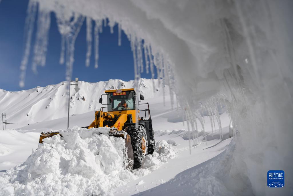 烏蘭薩德克養護站工人烏斯曼·巴克駕駛裝載機在獨庫公路的雪崩多發(fā)路段上清雪(5月9日攝)。