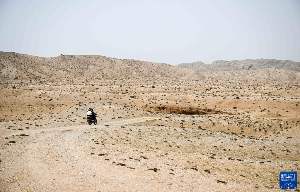 5月13日,駝峰(長(cháng)城)文物保護隊員騎著(zhù)摩托車(chē)在阿拉善左旗一處戈壁灘上行駛。