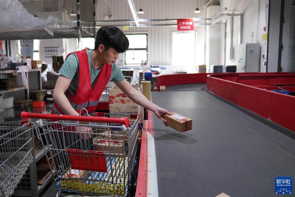 5月13日,在虹橋商務(wù)區保稅物流中心(B型),工作人員在打包分揀跨境電商貨物。