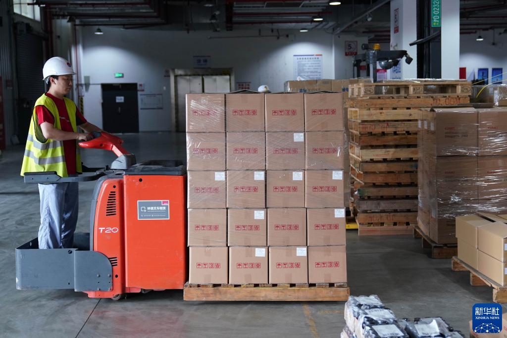 5月13日,在虹橋商務(wù)區保稅物流中心(B型),工作人員在運輸跨境電商貨物。