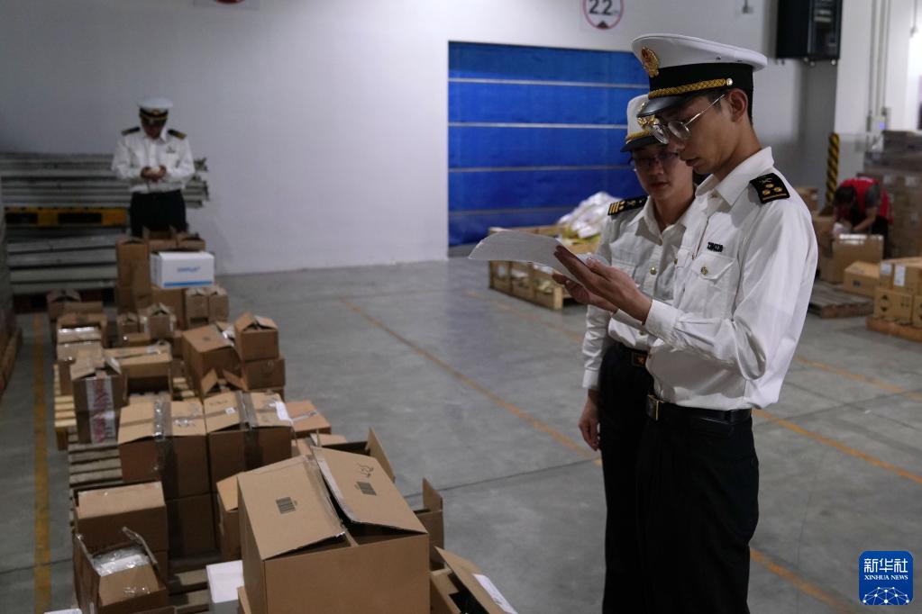 5月13日,在虹橋商務(wù)區保稅物流中心(B型),海關(guān)工作人員在查驗跨境電商貨物。