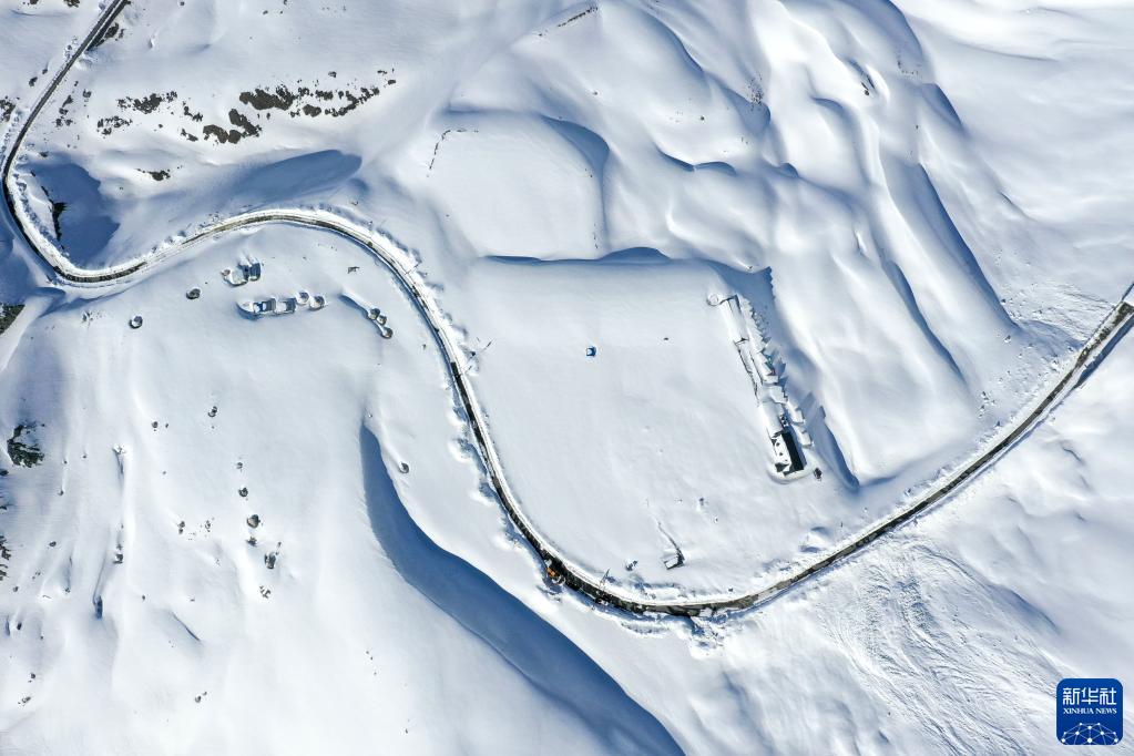 新疆獨庫公路蜿蜒穿越雪原(5月10日攝,無(wú)人機照片)。
