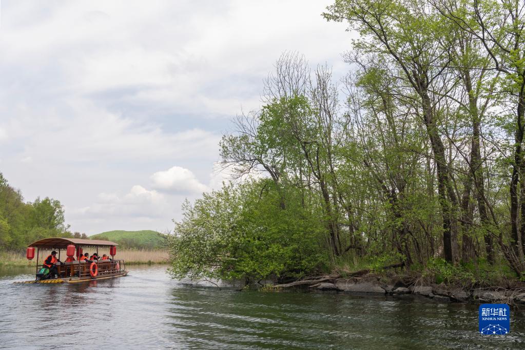 5月14日,游客乘船在黑龍江省牡丹江市的鏡泊湖世界地質(zhì)公園游玩。